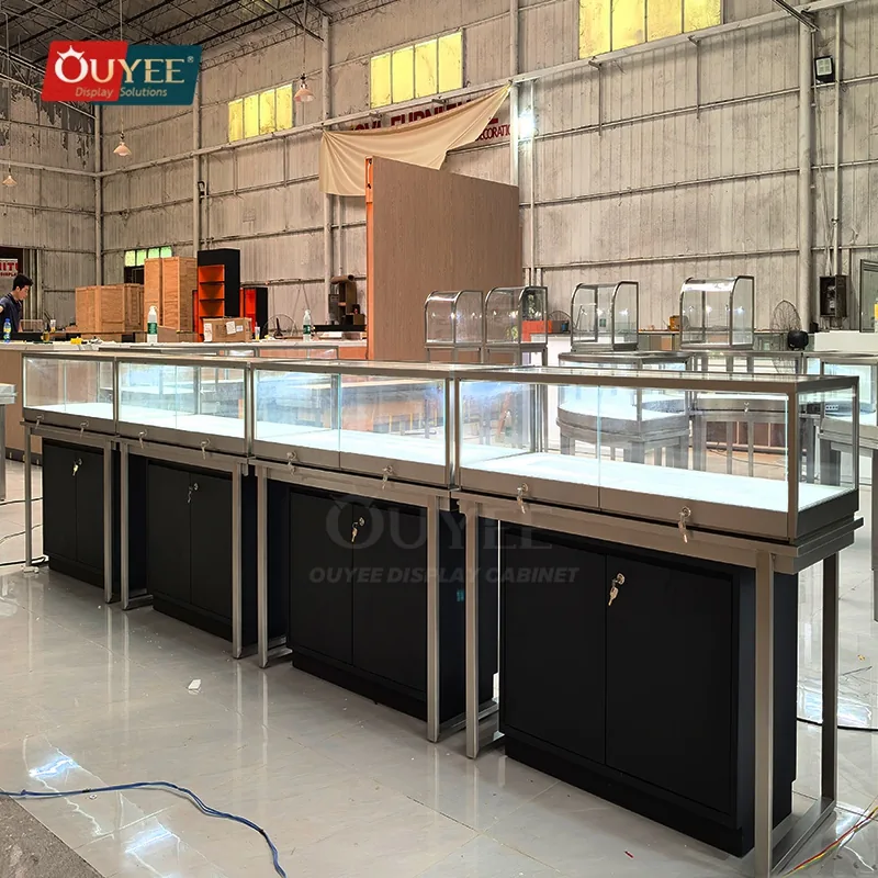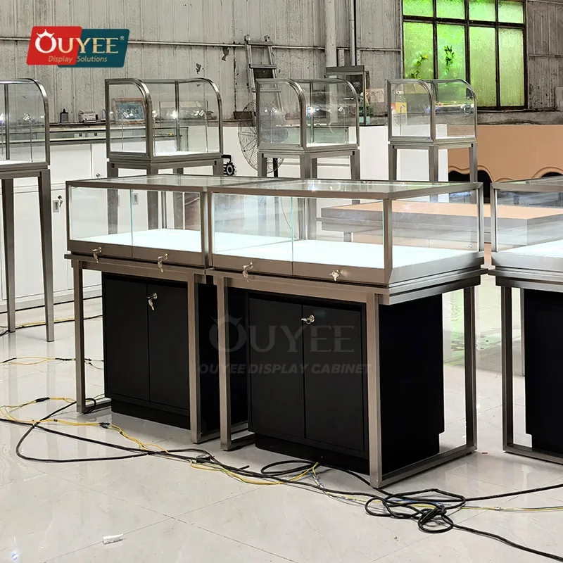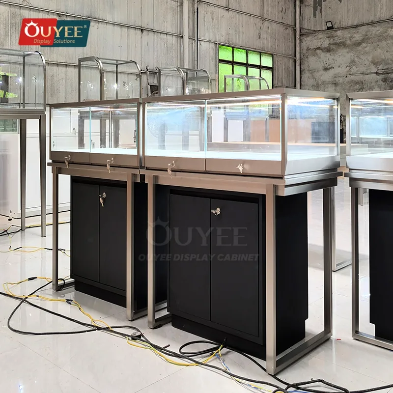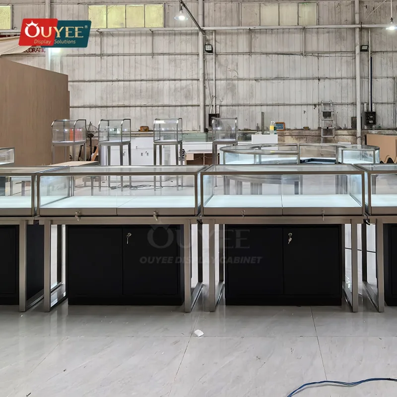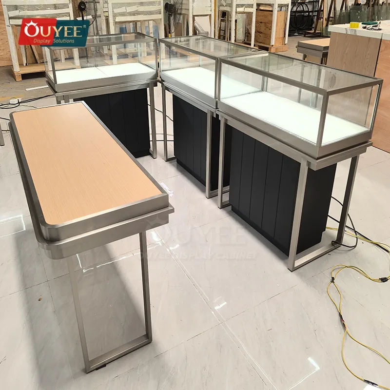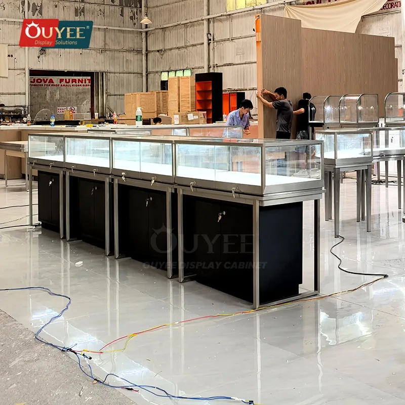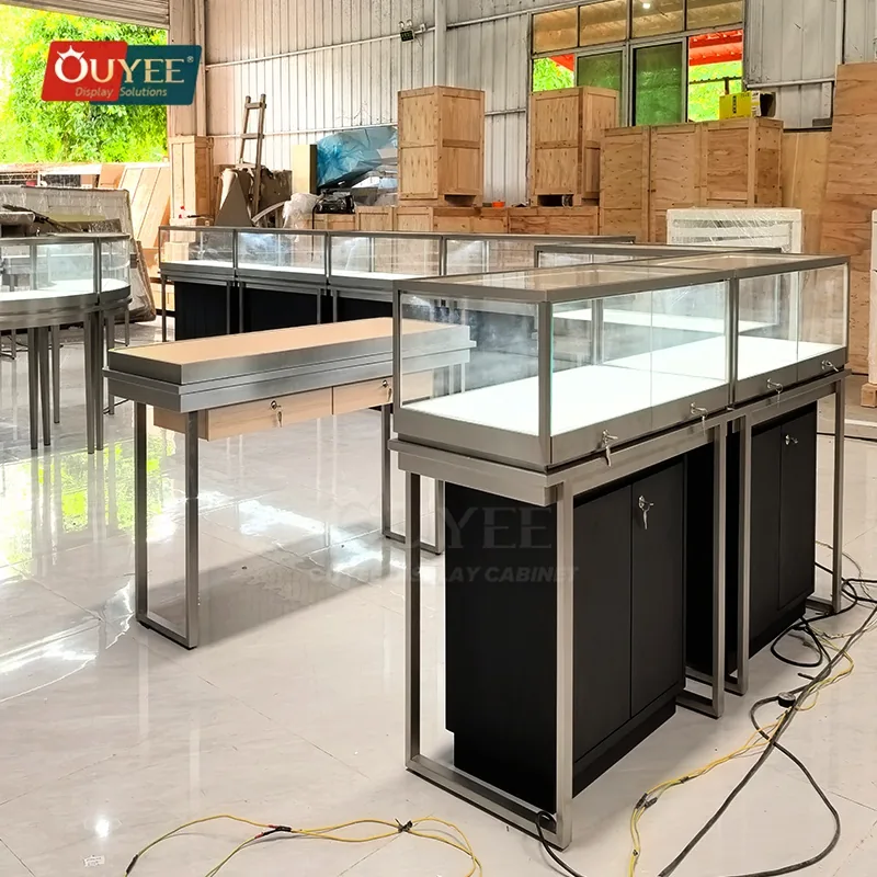 OUYEE can produce this model with tempered glass and metal framing. Depending on project needs, we can adjust dimensions, storage modules, lighting details, finish tones, and branding areas so the fixture fits the store concept and floor plan. For related inspiration, you can also browse glass display cabinet, display cases and our store fixture manufacturing capabilities.