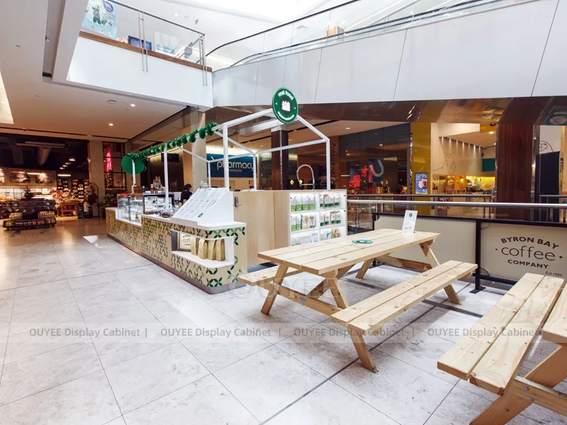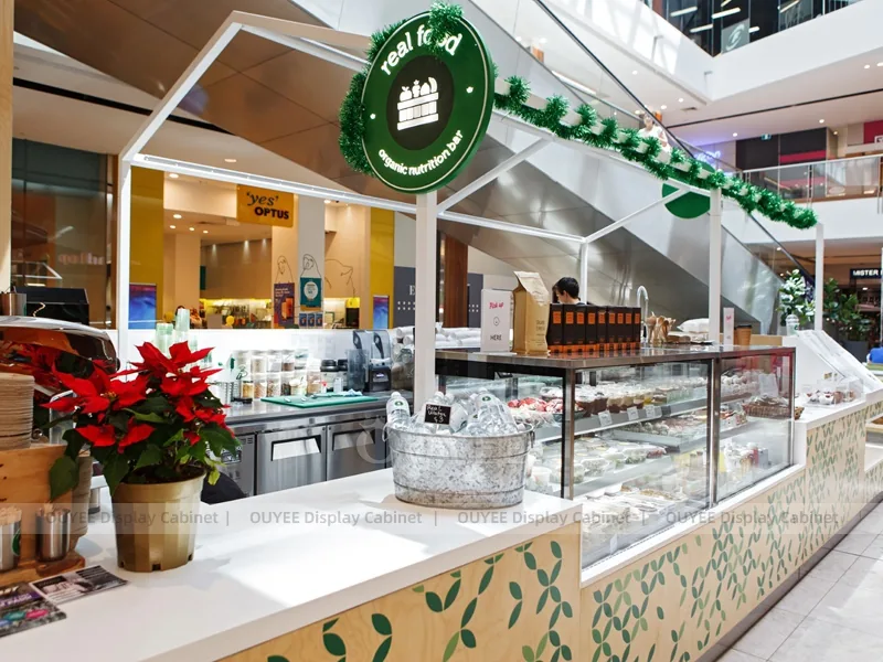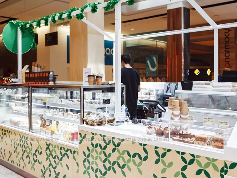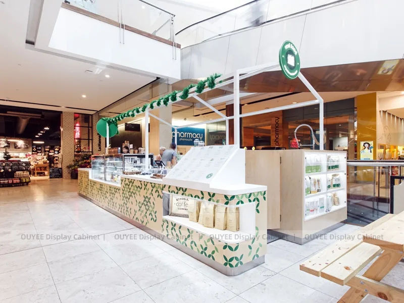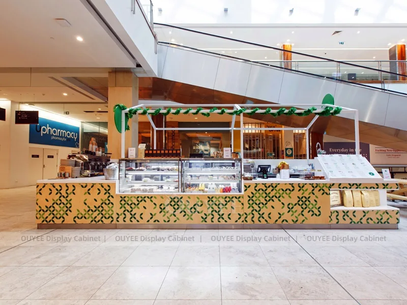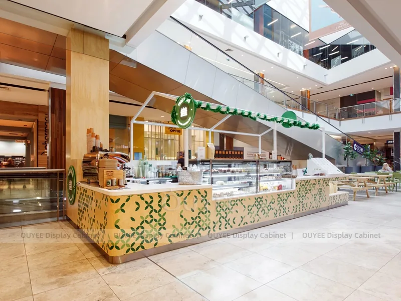 OUYEE can customize this model with custom color retail finishes and durable counter and storage modules. Store owners can adjust size, finish, layout, logo panel, counter height, storage structure, service opening, pickup area, cup storage, equipment clearance, menu areas, cup storage, topping display, lighting position, counter depth, and brand logo details to match the final shop drawing.