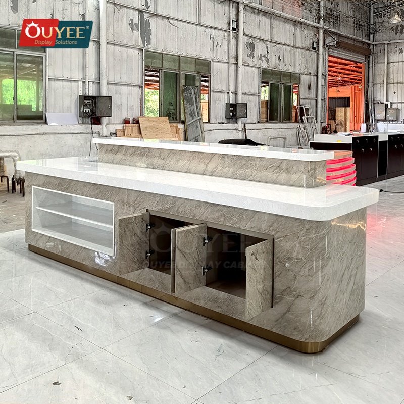 OUYEE can produce this model with metal framing and practical storage drawers. Depending on project needs, we can adjust dimensions, shelf spacing, accessory modules, finish tones, graphic areas, and lighting details so the fixture fits the brand language and the available floor plan. For related inspiration, you can also browse display shelves and our store fixture manufacturing capabilities.
