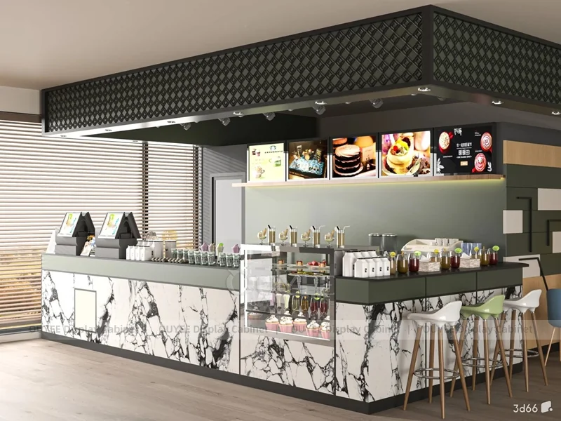 This coffee counter can be adjusted for front service, pickup, packaging, retail display, and back counter storage. It is suitable for new cafe builds, beverage shop renovations, and commercial kiosk projects that need a clear branded counter area.