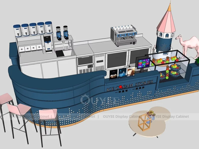 OUYEE supports coffee counter design, shop drawings, material selection, manufacturing, packing, and export delivery. We can customize the fixture according to your brand color, logo, store size, electrical planning, and installation requirements.