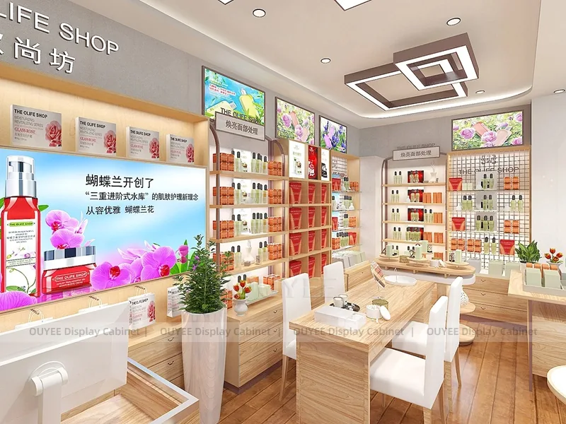 This configuration works well for skincare clinics, cosmetic consultation stores, dermatology retail spaces, and beauty service counters. It is suitable for cosmetic store openings, beauty shop renovations, department-store counter upgrades, pop-up retail projects, and custom display fixture programs that need consistent production quality.