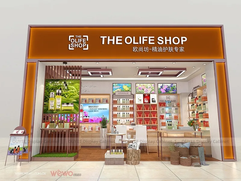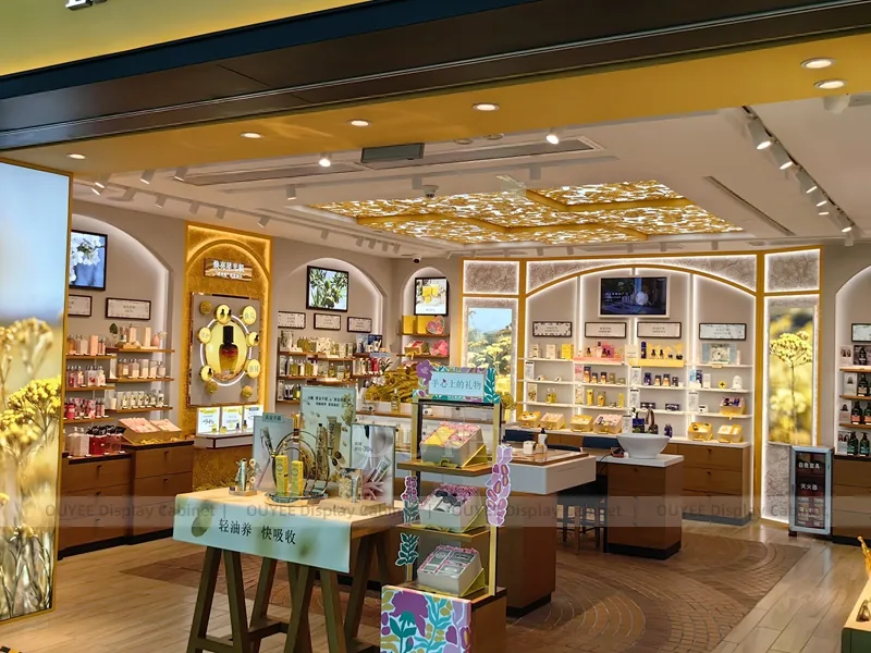 OUYEE can produce this model with wood-look panels, durable retail laminates, metal supports, and integrated shelf lighting. Dimensions, finish colors, shelf depths, light boxes, tester trays, logo panels, storage modules, and counter details can be adjusted to match the store plan and brand identity. Related inspiration is available across display shelves, wall display, display counter, and our store fixture manufacturing service.