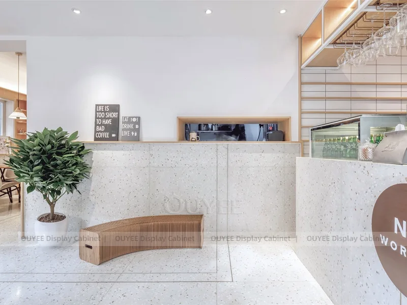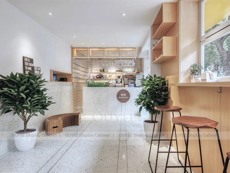 OUYEE can customize this model with custom color retail finishes. Store owners can adjust size, finish, layout, logo panel, counter height, storage structure, menu areas, cup storage, topping display, lighting position, counter depth, and brand logo details to match the final shop drawing.