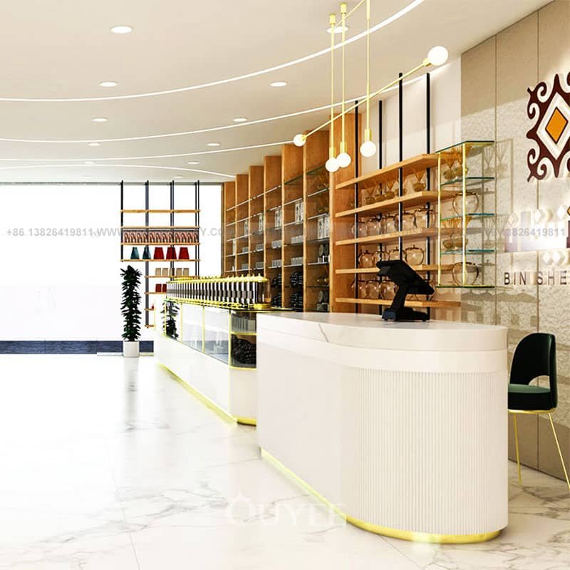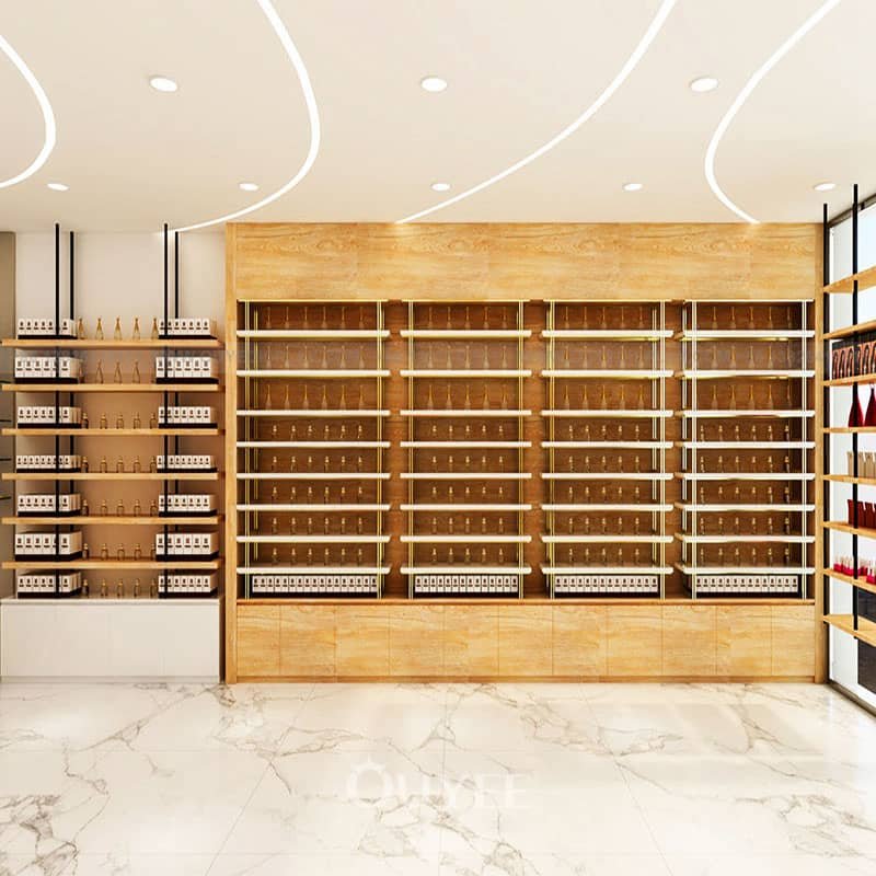 The design of these cabinets is sleek and minimalist, aligning with the modern aesthetic. Clean lines and minimal ornamentation create a sense of sophistication and elegance. The wooden finish can be chosen in various shades to match the overall color scheme of the shop, creating a cohesive and harmonious design.