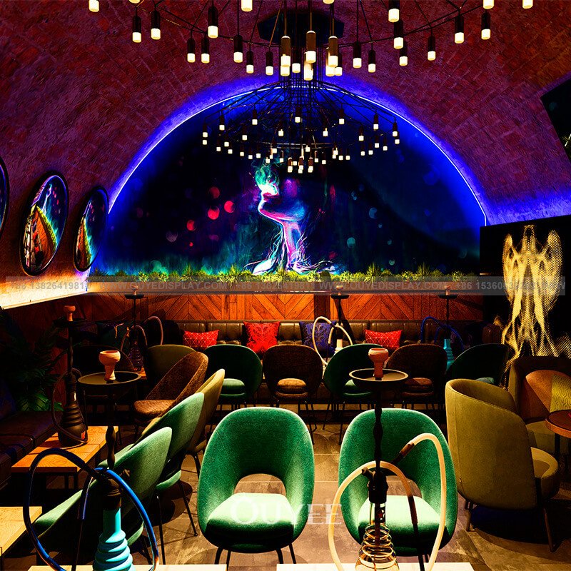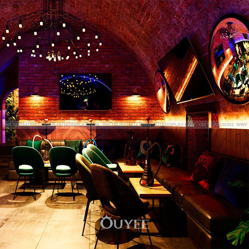 In addition to the booth seating, the decoration in a modern hookah lounge plays a crucial role in creating an inviting and stylish atmosphere. Smoke furniture displays are a popular choice for enhancing the overall ambiance of the lounge. These displays feature sleek and modern designs that complement the hookahs and add a touch of sophistication to the space. The smoke furniture displays are typically made of high-quality materials such as glass, metal, or wood, giving them a sleek and contemporary look. These displays showcase an array of hookah accessories, including bowls, hoses, and decorative elements, creating a visually appealing focal point in the lounge. With their elegant and eye-catching designs, smoke furniture displays not only enhance the overall decor of the hookah lounge but also serve as a functional and practical way to showcase the various components of the hookah experience.